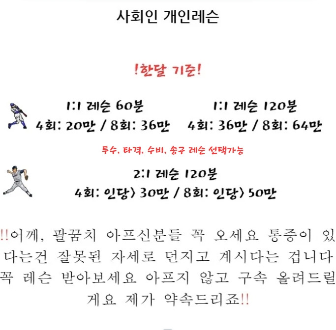 선수의 니즈를 파악하여 자세교정, 구속향상, 투구 메커니즘 등 전문적인 투수 트레이닝을 개인에게 맞는 방식으로 지도합니다. 주목!!!!! 어께나 팔꿈치가 아프신분들 구속이 늘지 않으신분들 무조건 찾아오십시오 아프지않고 구속도 올려드립니다 약속드리죠!!! 저는 폼에 대한 완벽주의자 입니다 긴말하지 않겠습니다 결과로 보여드리죠!! 주저마시고 연락주세요~ 통화가 불편하신 분들은 걱정마시고 카톡 오픈채팅방으로 연락주시면 됩니다