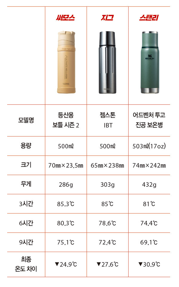 이 중 3종의 보온병을 선정했다. 브랜드는 스탠리, 써모스, 지그이다.