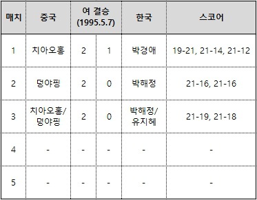 한국의 마지막 결승 상대는 최강 중국이었습니다. 중국은 한국과 마찬가지로 그룹별 예선 전승으로 8강에 올랐고, 8강에서 독일 3 대 0, 4강에서 루마니아를 3 대 1로 꺾고 결승에 올랐습니다. 한국과 중국의 마지막 결승전은 한국의 0 대 3 완패였습니다. 한국은 1매치에서 박경애가 치아오홍에 1-2(19-21, 21-14, 21-12)로 패한 후, 박해정, 박해정/유지혜가 덩야핑, 치아오홍/덩야핑에 차례로 완패를 당하며 최종 경기 결과 0 대 3으로 패했습니다.