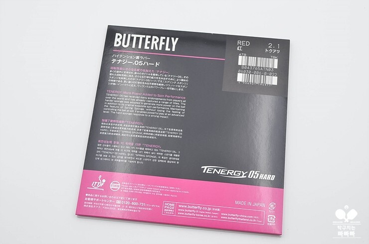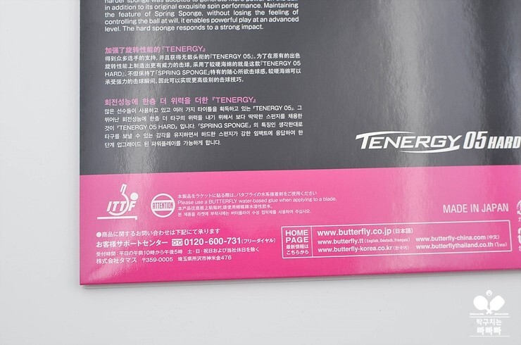 버터플라이 테너지 05 하드(Butterfly TENERGY 05 HARD)는 현재 출시된 테너지 시리즈 중에 스펀지 경도가 가장 높은 러버입니다. 스펀지 경도가 버터플라이 기준 43도, 독일 러버 기준 55도에 이릅니다. 범위를 디그닉스 시리즈까지 넓히면 디그닉스 09C(44도/56도) 다음으로 스펀지 경도가 높습니다. 하지만, 디그닉스 09C가 점착 러버인 것을 감안하면, 하이텐션 평면 러버 중에 가장 딱딱한 러버라 봐도 무방합니다.