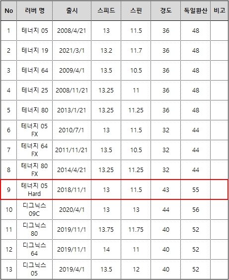 버터플라이 코리아 측에서 제공한 러버 성능을 비교하면, 테너지 05, 테너지 05 하드의 스피드(13), 스핀(11.5) 성능이 모두 똑같습니다. 수치만 보면, 테너지 05 하드는 스펀지 경도는 더 단단해졌지만, 성능은 기존 테너지 05와 똑같은 러버인 셈입니다. 테너지 05 하드와 디그닉스 05를 비교하면, 디그닉스 05가 스펀지는 경도는 낮지만, 스피드(13.5), 스핀(12) 수치는 정확히 0.5씩 높습니다.