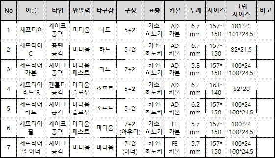 기존 세프티어 시리즈는 표층에 키소히노키를 사용하고, 카본으로 AD 카본을 사용했습니다. 이번에 새로 출시된 세프티어 필, 세프티어 필 이너는 표층에 키소히노키를 사용한 것은 똑같지만, 카본으로 FE 카본을 사용했고, 두께가 5.7mm로 더 얇아졌습니다. AD 카본이 뛰어난 반발력이 장점인 소재라면, FE 카본은 부드러움과 안정감이 강화된 특수 소재입니다.