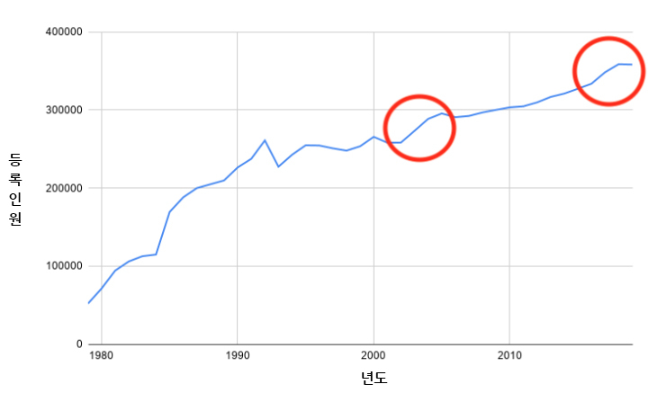 최근 20년 정도로 보면, 2003년부터 2005년경으로, 2012년 이후에 증가 경향이 커지고 있습니다(빨강색 동그라미). 2000년대 전반은 일본 여자 팀이 세계 선수권에서 메달을 획득하게 되어 활약이 눈에 띄기 시작한 시기와 겹칩니다. 또, 2012년 이후는 런던, 리오데자네이루의 2회의 올림픽에서의 메달 획득을 시작해, 남녀 대표의 활약이 텔레비전 등에서 크게 보도되게 되었습니다. 원인은 이것만이 아닐지도 모릅니다만, 역시 톱 선수의 활약에 의한 영향은 적지 않다고 말할 수 있을 것입니다.