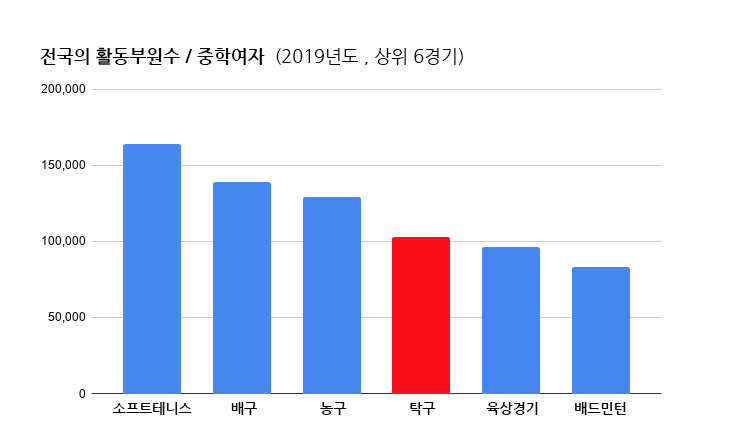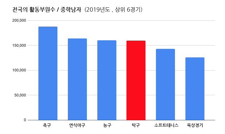 다른 스포츠와 비교해 봅시다. 전국의 중학교 체육 연맹에 가맹하는 부 활동의 부원수에서는, 남자는 축구, 야구, 농구에 이어 4위가 되고 있습니다. 여자도 소프트 테니스, 배구, 농구에 이은 4위에 랭크 하고 있어, 남녀 모두 인기의 부활동인 것을 볼 수 있습니다(공익재단법인 일본 중학교 체육 연맹, 2019년도). 최근 10년 정도로 인원수가 줄어드는 종목 많은 가운데, 탁구는 남녀 모두 증가하는 경향이 있습니다.