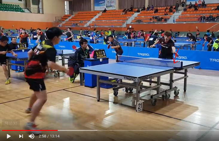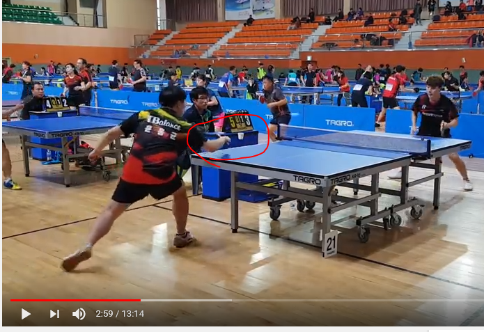 2분 55초쯤에 윤홍균 선수의 드라이브를 a4로 리시브하는데 윤홍균 선수가 커트로 다시 받아넘기는 영상을 볼 수 있다.