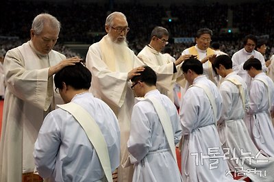 ▲ 사제서품식 중 사제단의 안수 장면.