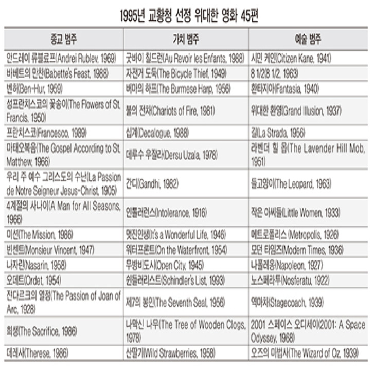 교황청은 영화 탄생100주년을 맞은 1995년 45개의 ‘위대한 영화들’을 엄선했다.