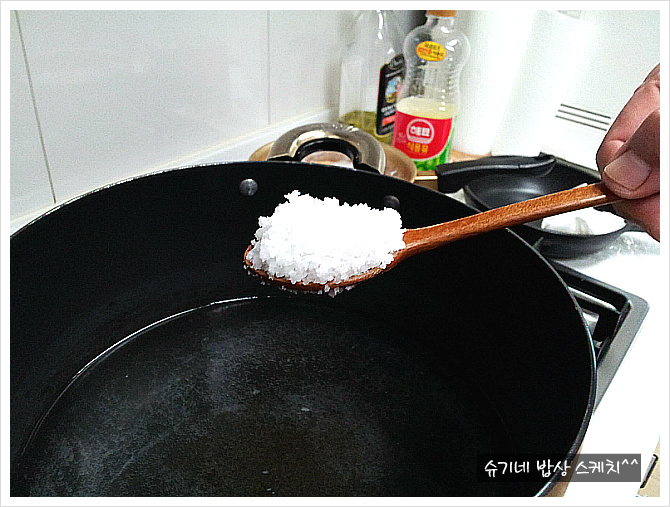 물이 끓으면 숟가락 수북히 굵은소금 6개 넣어 휘휘저으면 다 녹습니다.