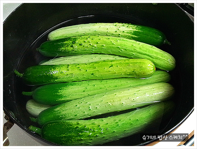 소금물이 펄펄 끓으면 가스불 끄고 거기에 오이를 넣으세요.