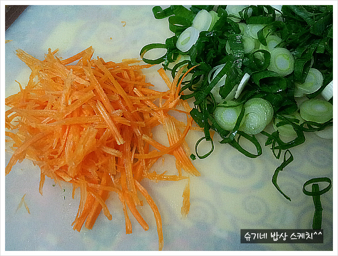 쪽파가 더 맛있지만 없으므로 대파 쫑쫑썰고 당근 얇게 채쳤습니다.