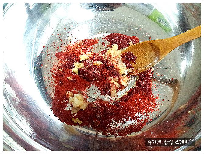 고추가루, 다진마늘, 생강, 설탕, 매실청, 새우젓, 멸치액젓, 맛술 약간 섞어