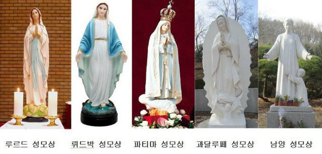 성모상이나 성화, 십자고상은 하느님께 대한 신앙을 표현하는 상징물이다. 하느님께 공경을 드리기 위해 성상과 성화와 같은 상징물들이 초대교회 때부터 생겨났다. 당시 대부분의 사람들이 글을 몰랐기때문에 이들에게 신앙을 가르치기 위해서는 성서나 구원역사의 내용을 눈으로 볼 수 있게 하는 시각적인 자료가 필요했다. 그래서 여러 가지 동상이나 그림들이 자연스럽게 생겨나게 되었다. 성모상은 성모 마리아에 대한 공경과 신심을 위해 만들어졌다. 성모상은 하나의 상징물로서 기도하는 데 집중할 수 있도록 도와주는 것이다. 우상은 그 상 자체가 신적인 힘을 가지고 있는 것을 말하기 때문에 성모상은 우상이 아니다. 그리고 우리가 성모님께 저희를 위하여 빌어달고 기도를 청하는 것은 성모님께서 예수님과 가장 가까이 계시고, 성모님의 청을 예수님께서 거절하지 않을 것이라는 믿음 때문이다. 성모상은 예수 그리스도의 구원에 협력하는 성모 마리아의 다양한 모습이 여러 가지로 묵상되고 반영되어 다양하게 만들어졌다. 또한 1800년 이후로 루르드나 파티마와 같은 곳에서 일어난 성모 발현을 계기로 그 때 증언한 성모상이 추가되어 더욱 다양한 모습이 되었다. 루르드 성모상은 1858년 프랑스 루르드에서 발현한 성모님의 모습을 재현한 것인데 각 가정에 모셔둔 소형 성모상과 성모동굴의 성모상은 대부분 이러한 모습이다. 머릿수건과 옷은 모두 흰색이고, 푸른색 허리띠를 두르고 있으며, 묵주를 오른쪽 팔에 걸고 두 손을 모아 기도하는 모습이다. 그리고 발등에는 장미송이가 놓여있다. 국내에 루르드 성모상이 많이 보급된 이유는 한국에 가장 먼저 진출한 파리 외방전교회의 영향 때문이다. 뤼드박 성모상은 레지오 마리애의 회합에 사용하는 성모상이기 때문에 우리가 자주 볼 수 있는 성모상이다. 은혜의 성모상 또는 모후의 성모상이라고도 부르는 이 성모상은 1830년 프랑스 뤼드박에 발현한 성모 마리아의 모습이다. 뤼드박의 성모상은 양팔을 펼친 모습으로 머리에는 흰 수건을, 어깨에는 푸른 망토를 두르고 발아래에는 지구를 감싸고 있는 뱀을 밟고 있는 모습이다. 처음에는 메달 형태로 제작되었는데 시간이 흐름에 따라 성화, 성상의 형태로 제작되기 시작했다. 파티마 성모상은 포르투갈의 파티마에서 1917년 5월13일부터 6번에 걸쳐 루시아, 프란치스코, 히야친타라는 어린 목동들에게 발현하셨던 모습을 재현한 것이다. 하얀 수건을 쓰고 흰옷을 입고 있으며, 가슴에 금색지구 모양의 목걸이를 하고, 두 손은 묵주를 걸은 채 합장하고 있다. 또 두 발은 구름을 밟고 있으며, 구름 아래에는 참나무 가지들이 늘어져 있다. 이 밖에도 1931년 멕시코 과달루페에서 인디언 여인의 모습으로 발현한 과달루페의 성모상, 1933년 벨기에 바뇌에서 루르드 성모와 비슷하지만 머리를 약간 왼쪽으로 기울인 모습으로 발현한 바뇌의 성모상 등이 있다. 이전에는 세계 곳곳에서 발현한 모습의 성모상을 주로 사용했지만, 최근에는 종교 미술의 발달로 한국인의 특징적인 얼굴표정과 미학을 형상화한 성모상이 보인다. 남양성모성지에서는 ‘남양 성모상'을 만날 수 있다. 오상일(프란치스코) 작가가 제작한 3.5m 높이의 성모상은 여느 성모상과 달리 머리 수건을 쓰지 않고 단아하게 머리를 묶고 있으며 한국적인 느낌을 살리기 위하여 전체적으로 한복이 지닌 아름다운 선을 강조하여 조각하였다. 두 팔을 벌린 성모상의 모습에서 ‘엄마’처럼 포근함과 친근감을 느낄 수 있다. 구산성지의 성모상은 왕관을 쓰고 오른손에는 지시봉을 들고, 왼팔로는 아기예수를 안고 있는 모습인데 당시 서울대학교 미대학장이었던 김세중(프란치스코) 교수의 작품이다. 신학자들은 “성모상과 같은 성물 자체를 공경의 대상으로 삼거나 은총을 내려주는 신비체로 간주해서는 안 된다”며 “성물은 하느님의 현존을 체험하고 구원의 신비를 묵상하도록 도와주는 ‘도구’라는 점에 유의해야 한다”고 말했다. -------------------------------------------------------------- 성모상의 종류 '루르드 성모상', '파티마 성모상'