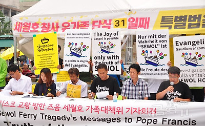 교황 방한 하루 전인 13일, 세월호 참사 일반인 희생자 유가족 대책위원회와 희생자 · 실종자 · 생존자 가족 대책위원회는 광화문광장에서 내외신 기자회견을 열었다.