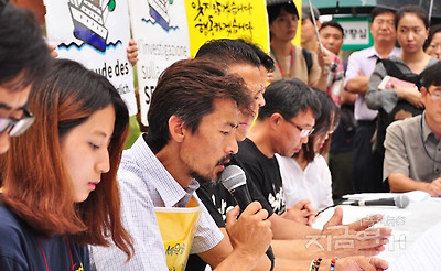 ▲ 교황 방한을 하루 앞둔 13일, 세월호 참사 일반인 희생자 유가족 대책위원회와 희생자 · 실종자 · 생존자 가족 대책위원회가 광화문광장에서 내외신 기자회견을 열었다. ⓒ정현진 기자