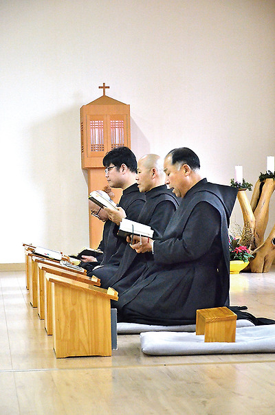 숙소를 빠져나와 옆 건물에 있는 성당으로 하나둘 모여든 수사들이 제대 십자가 앞에 엎드려 큰절을 한 뒤 제대 양쪽에 자리를 잡았다. 맑은 종소리와 함께 시작된 아침기도. "주님, 내 입시울을 열어 주소서. 내 입이 당신 찬미를 전하오리다…."