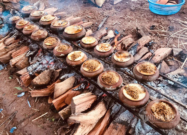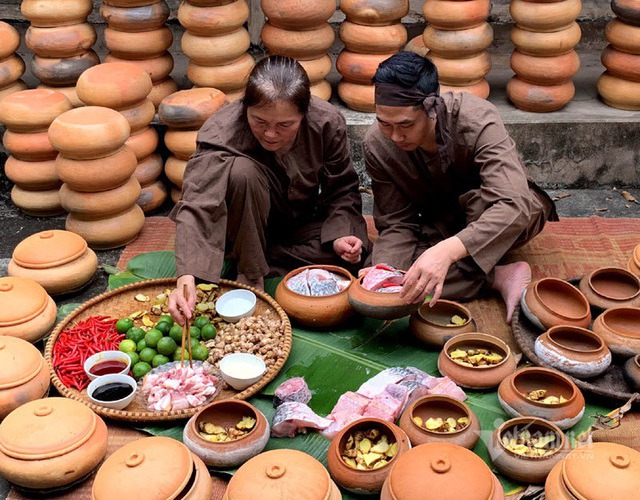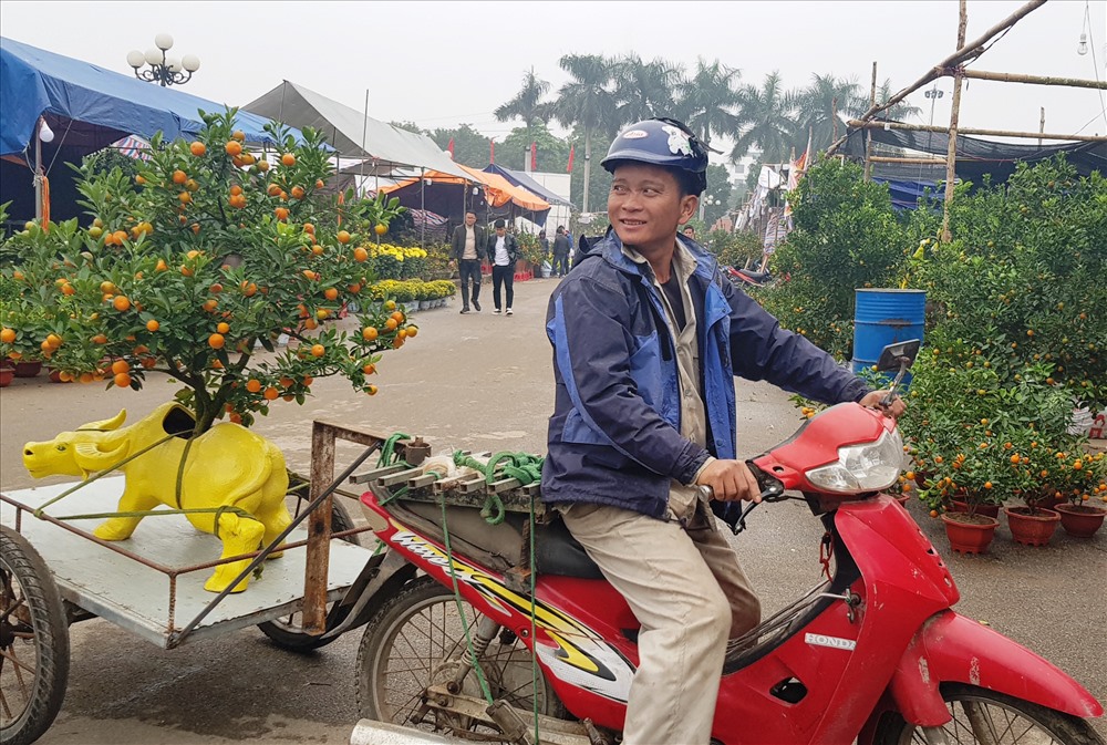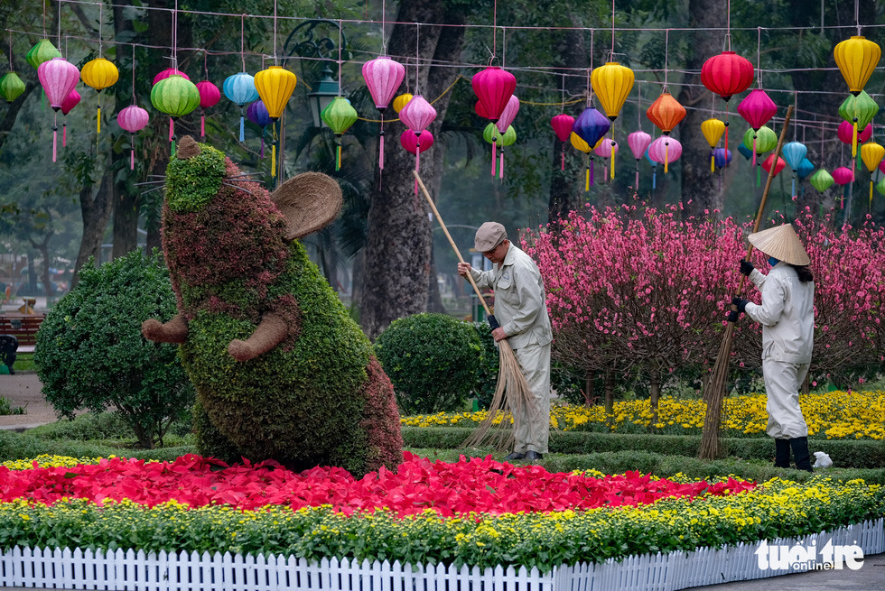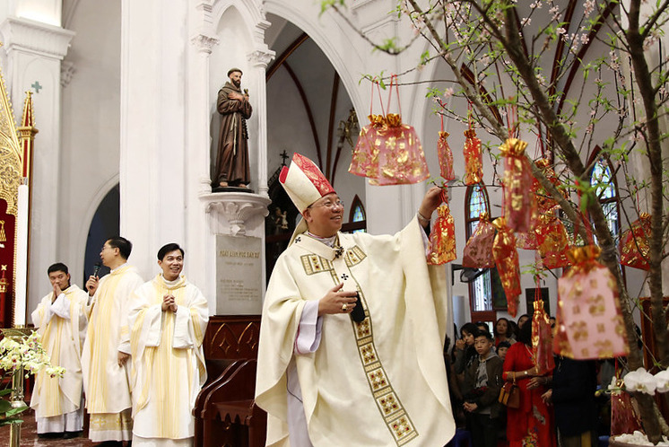 하노이대주교님이 설을 맞이하여 복숭아 나무에 복주머니를 달고 계신 모습
