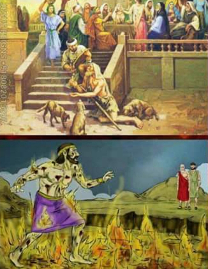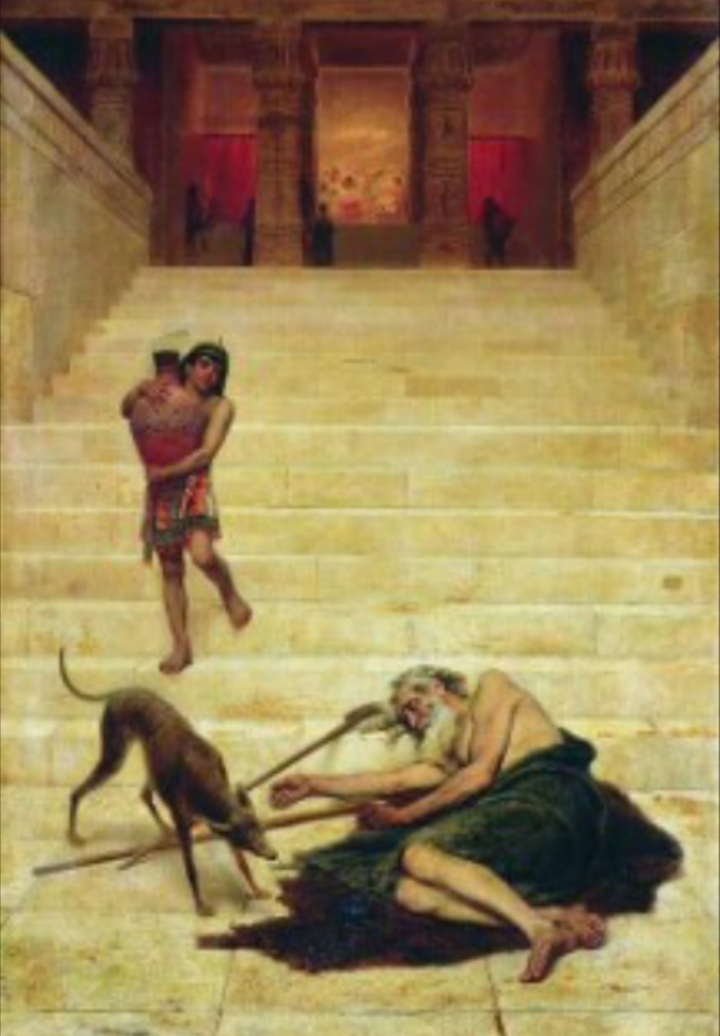아무 동정도 받지 못한 라자로는 굶주린 배를 채우기 위해 부자의 상에서 떨어지는 부스러기라도 먹으려 했다. 게다가 불치의 병이 그를 괴롭혔다. 개들조차 그의 종기를 핥으며, 그를 해치지 않고 돌보고 있다. 짐승들은 아픈 데를 혀로 핥아 고통을 가라앉히고 상처를 낫게 한다. 그런데 부자는 개들보다 잔인했다. 라자로를 가엾이 여겨주지도 않았고 무자비하게 굴었기 때문이다.