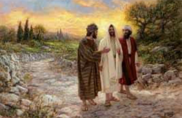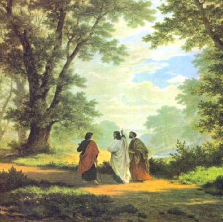 두 제자가 길을 가며 예루살렘에서 일어난 일에 대해 이야기를 나누고 있다. 그 이야기는 예수님의 죽음과 유대인들의 불의한 짓에 대한 이야기였다. 그분의 죽음을 슬퍼하며 이야기하고 있었다. 주님께서 다시 살아나신 것은 모르고 있다. 그때 부활하신 주님께서 나타나시어 함께 걸으시면서 다정하게 말을 건네신다. 그분을 알아볼 눈이 열리지 않았기 때문이다. “걸어가면서 무슨 말을 서로 주고받느냐?”(17절)