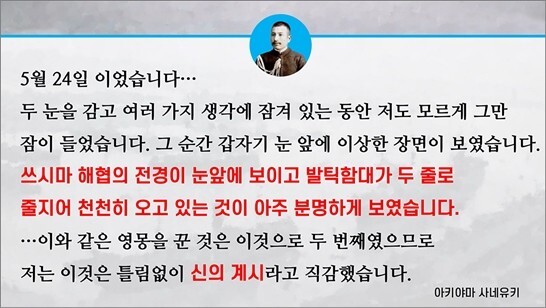쓰시마 해협의 전경이 눈앞에 보이고 발틱 함대가 두 줄로 줄지어 천천히 오고 있는 것이 아주 분명하게 보였습니다. ‘이젠 됐구나’ 하고 생각한 순간, 저는 번득 제 정신이 들었습니다. 그러나 이와 같은 영몽을 꾼 것은 이것으로 두 번째였으므로 저는 곧 이것은 틀림없이 신(神)의 계시라고 직감했습니다. 그리고 이제 되었구나,