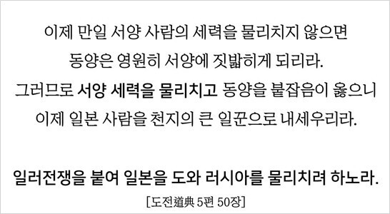 道典5편50장) 이제 만일 서양 사람의 세력을 물리치지 않으면 동양은 영원히 서양에 짓밟히게 되리라. 그러므로 서양 세력을 물리치고 동양을 붙잡음이 옳으니 이제 일본 사람을 천지의 큰 일꾼으로 내세우리라.”