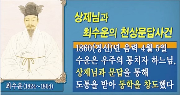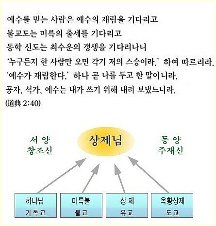 동경대전(東經大全)과 수운가사(水雲歌詞)에서 말하는 ‘상제’는 곧 나를 이름이니라.(道典 2:30)
