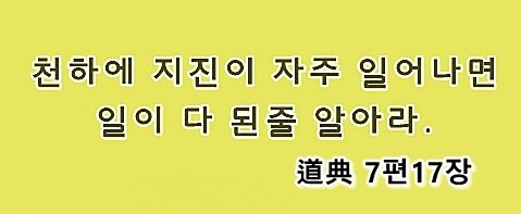 ■ 道典 5:25) 이 지방을 지키는 모든 신명을 서양으로 보내어 큰 전란을 일으키게 하였나니 이 뒤로는 외국 사람들이 주인 없는 빈집 드나들 듯하리라. 그러나 그 신명들이 일을 다 마치고 돌아오면 제 집 일은 제가 다시 주장하게 되리라.(道典 5:25)