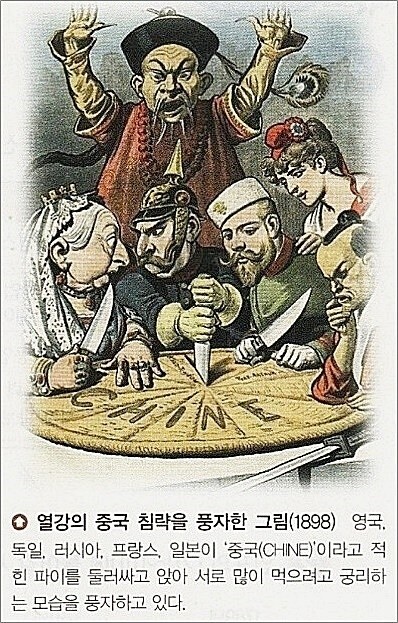 광대한 영토와 고도의 전통문화를 가진 중국이 일단 세계 정세에 눈을 뜨고 국민들이 단결하면 순식간에 상황을 역전시킬 수 있는 저력을 가지고 있다고 생각했다. 그 때문에 중국은 그나마 독립을 보존하며 체면을 유지하는 듯 했다. 그런데 청일전쟁(1894~1895)에서 중국이 패배함으로써 중국의 약체가 드러나자 러시아, 영국, 독일, 프랑스, 미국 등 열강들은 기다렸다는 듯이 달려들어 각기 지역을 분할하여 조차했다.