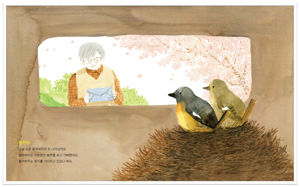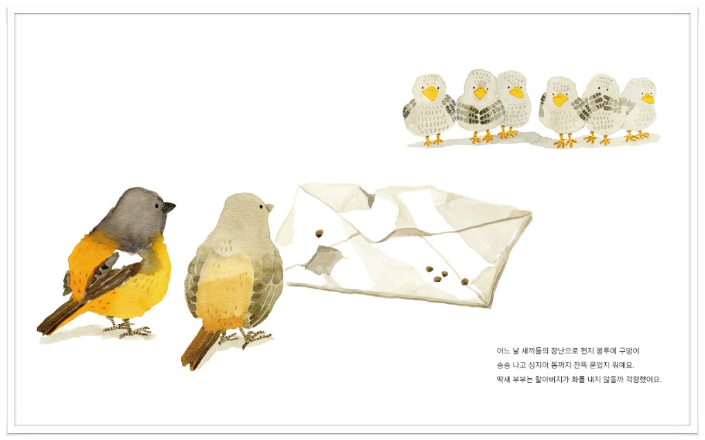 딱새 부부는 할아버지가 화를 낼까 걱정했지만 할아버지는 편지를 집어 들고 빙그레 웃음을 지었어요.