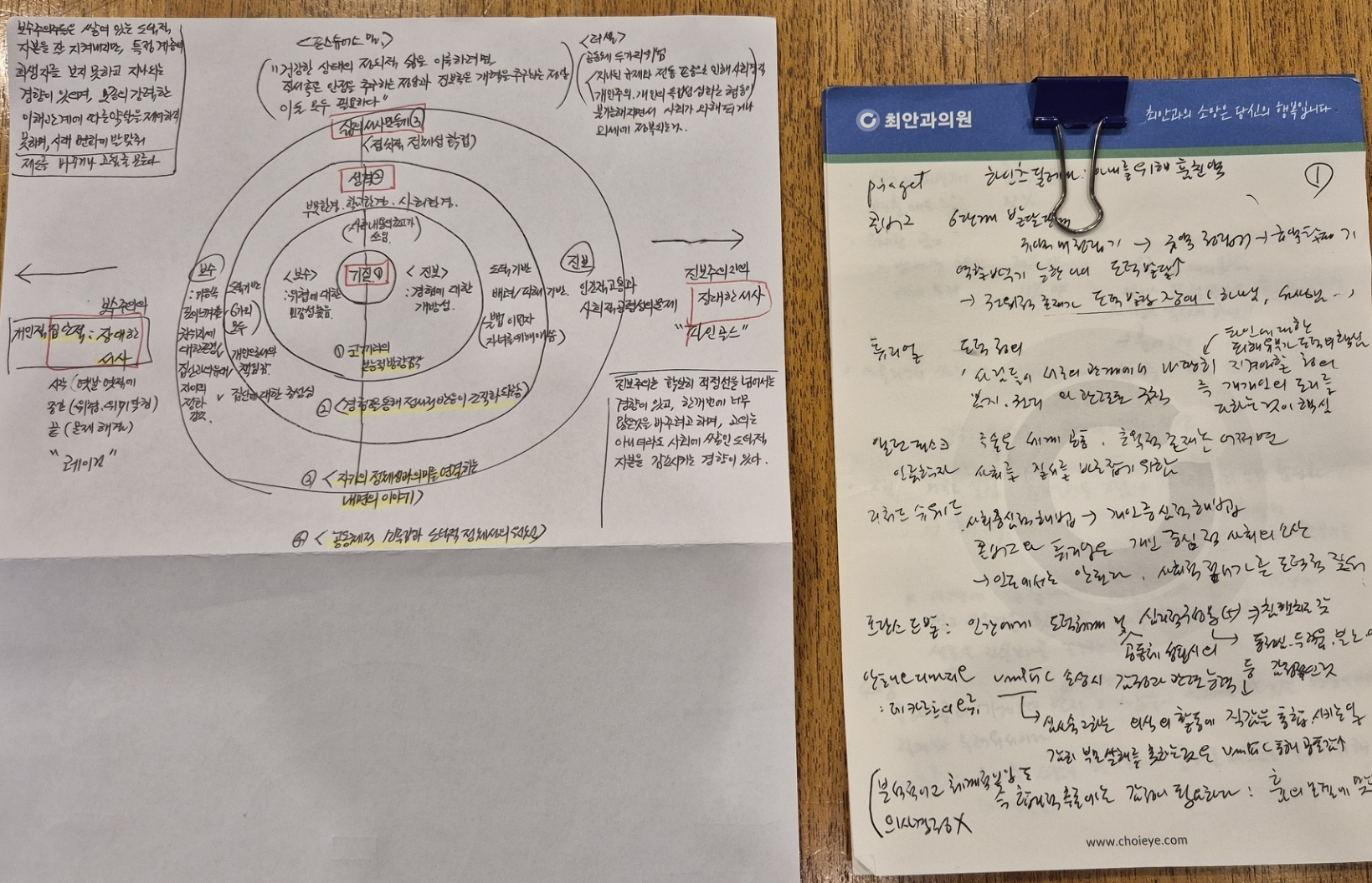 (아래 사진 좌측은 묵은 최모, 우측은 새얼굴 최모님의 독서요약 메모지... 주의:여기서 좌측, 우측은 보수, 진보와 무관함)