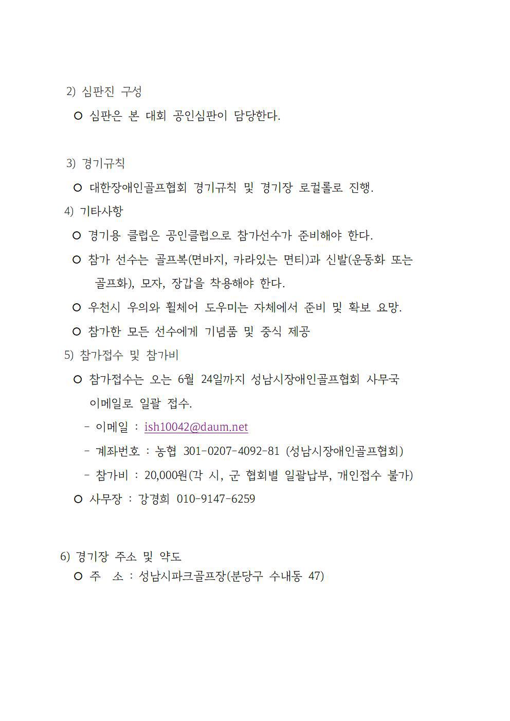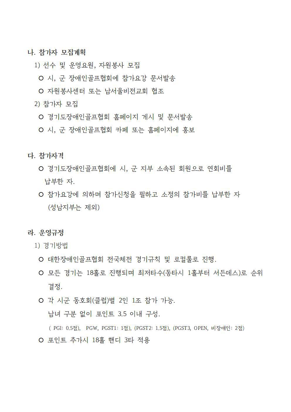 [스크랩] 2019년 제6회 성남시장기 장애인파크골프대회 작성자아짐(박동주)|작성시간19.05.26|조회수213 목록 댓글 0 글자크기 작게가 글자크기 크게가 참가요강.hwp 첨부파일첨부된 파일이 8개 있습니다. jpg 파일 참가요강001.jpg 다운로드 jpg 파일 참가요강002.jpg 다운로드 jpg 파일 참가요강003.jpg 다운로드 jpg 파일 참가요강004.jpg 다운로드 jpg 파일 참가요강005.jpg 다운로드 jpg 파일 참가요강006.jpg 다운로드 jpg 파일 참가요강007.jpg 다운로드 hwp 파일 참가요강.hwp 다운로드 다음검색 스크랩 원문 : 경기도장애인골프협회 현재 게시글 추가 기능 열기 북마크 공유하기 신고 센터로 신고 댓글 댓글 0 댓글쓰기 답글쓰기 댓글 리스트