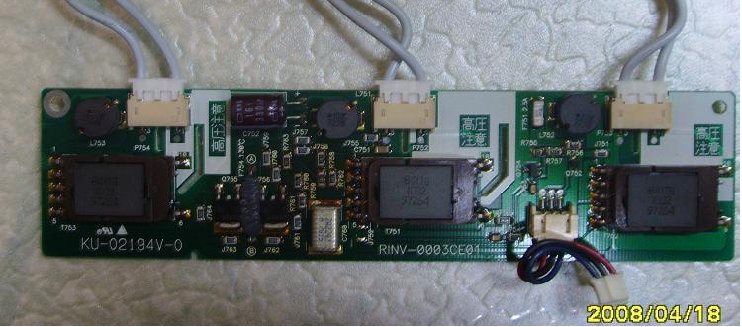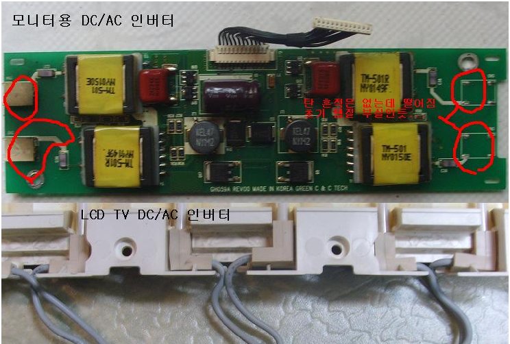 위의 조명장치는 CCFL 입니다. 우리나라말로 하자면 냉음극형광램프라고 하는데 형광등과 비슷한 원리지만 구동은 형광등과 전혀 다르고 약 3000~4000V 교류로 구동을 해줍니다. 구동전압은 형광램프의 길이밝기에 따라 달라집니다. CCFL에 연결된 선을 보면 보기보다 꽤 굵은 선으로 연결되어 있죠. 그것은 고압이 흐르기 때문입니다.
