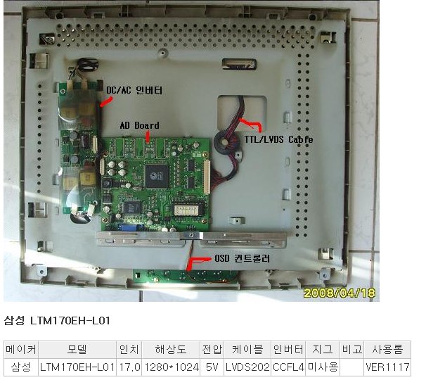 | 삼성 | LTM170EH-L01 | 17.0 | 1280*1024 | 5V | LVDS202 | CCFL4 | 미사용 | VER1117 |