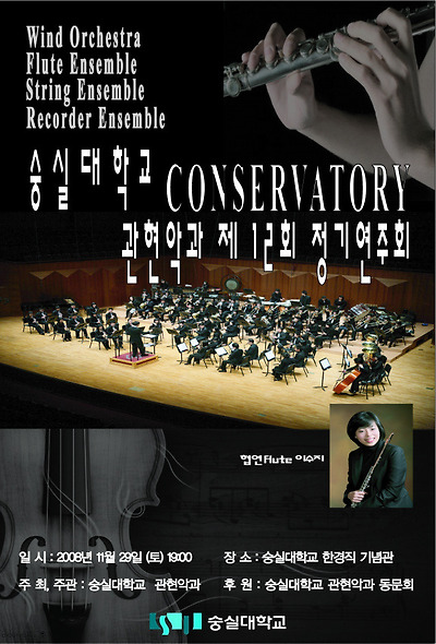 높아진 하늘의 청명함과 옷깃을 여미게 하는 바람이 깊어가는 가을을 느끼게 하는 11월입니다. 애국가를 작곡하신 안익태선생을 비롯해 한국 음악의 역사를 이끌어온 숭실대학교의 음악적 전통을 이어가고 있는 숭실대학교 conservatory 관현악과 정기연주회가 오는 11월29일 7시 숭실대학교 한경직 기념관 에서 연주회를 갖습니다. 지난 십여 년간 음악에 대한 열정과 꾸준한 노력을 바탕으로 괄목할만한 성장을 이루고 있는 숭실대학교 conservatory 관현악과는 이미 국내 유수관악제, 전국음악대학 심포니밴드 연주회등에 참가하여 그 실력을 널리 인정받으며 다양한 레파토리로 국내심포닉밴드의 교두보 역할을 하고 있습니다. 특히 이번 정기연주회에는 플륫앙상블, 스트링앙상블, 리코더앙상블의 연주가 더욱 더 다양한 음악적 색채를 느끼게 해드릴 것 입니다. 젋음의 열정과 음악의 향기가 어울어진 이번 연주에 참석하시어 국내음악계를 이어갈 젊은이들의 향연을 함께 하며 지켜봐 주시길 바랍니다.