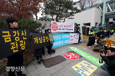 한편, 참가자들은 외교부로 들어서는 비건 대표를 향해 “PEACE TREATY NOW!(평화협정)”, “NO SANCTION!(제재해제)!”, "금강산 관광/개성공단 가동 재개!" 구호를 힘차게 외쳤습니다.