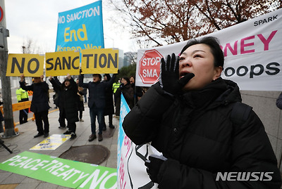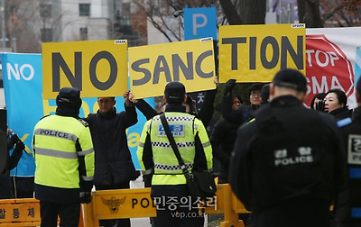 참가자들이 ‘NO SANCTION (제재해제)’ 피켓을 높게 들어 보이고 있다. (사진출처 : 민중의소리)