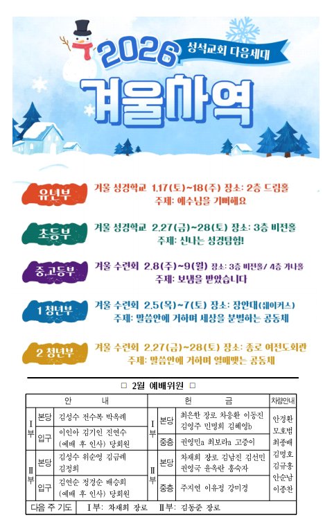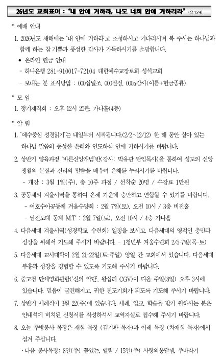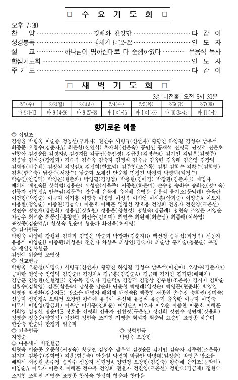 2026.02.01.주보 작성자김성수|작성시간26.02.06|조회수82 목록 댓글 0 글자크기 작게가 글자크기 크게가 대한예수교장로회 마장동 성석교회 원로목사 김성윤 담임목사 박유관 2026.02.01. 주보 다음검색 현재 게시글 추가 기능 열기 북마크 공유하기 신고 센터로 신고 댓글 댓글 0 댓글쓰기 댓글 리스트