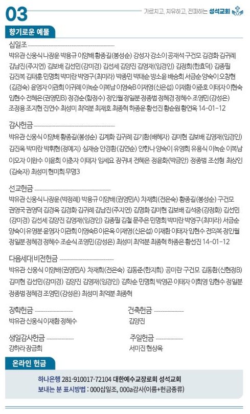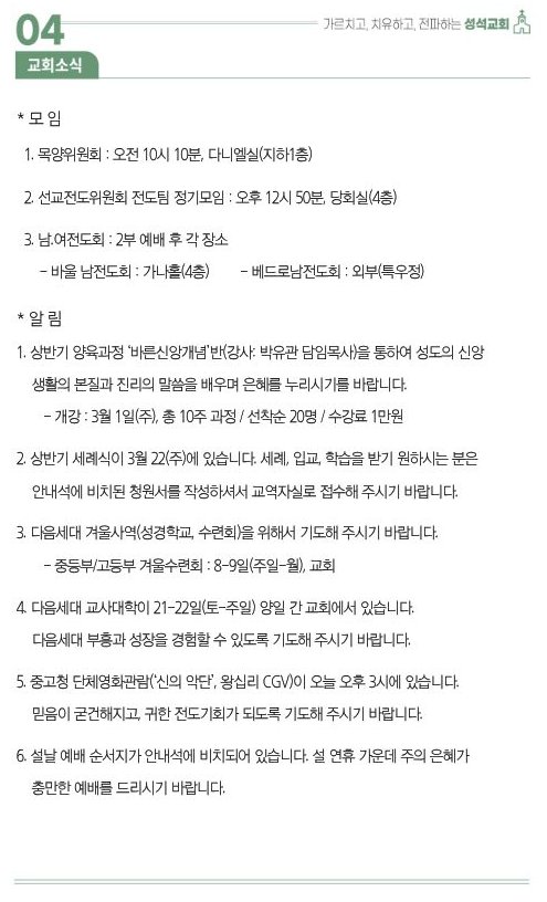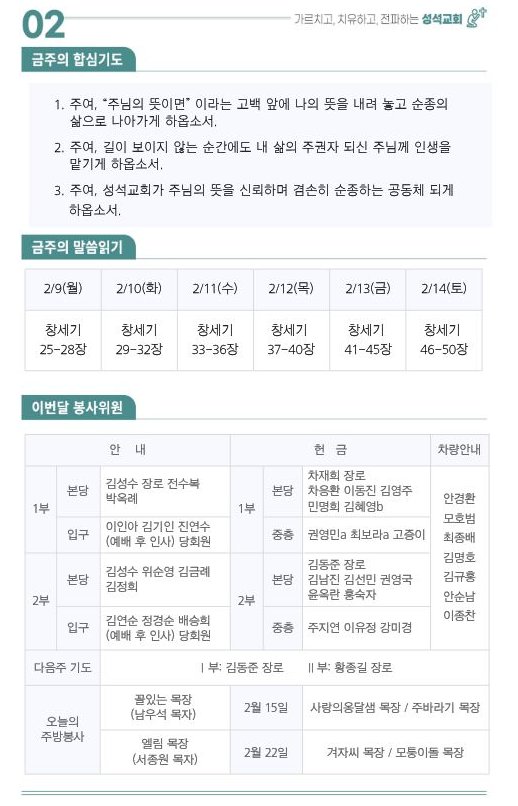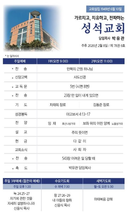 2026.02.08.주보 작성자김성수|작성시간26.02.07|조회수90 목록 댓글 0 글자크기 작게가 글자크기 크게가 대한예수교장로회 마장동 성석교회 원로목사 김성윤 담임목사 박유관 2026.02.08. 주일 주보 다음검색 현재 게시글 추가 기능 열기 북마크 공유하기 신고 센터로 신고 댓글 댓글 0 댓글쓰기 댓글 리스트