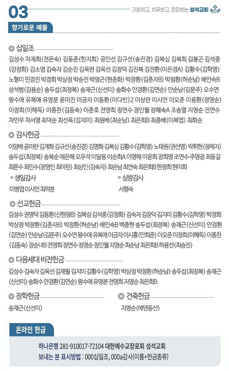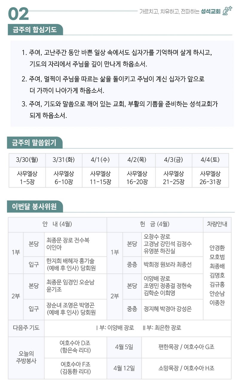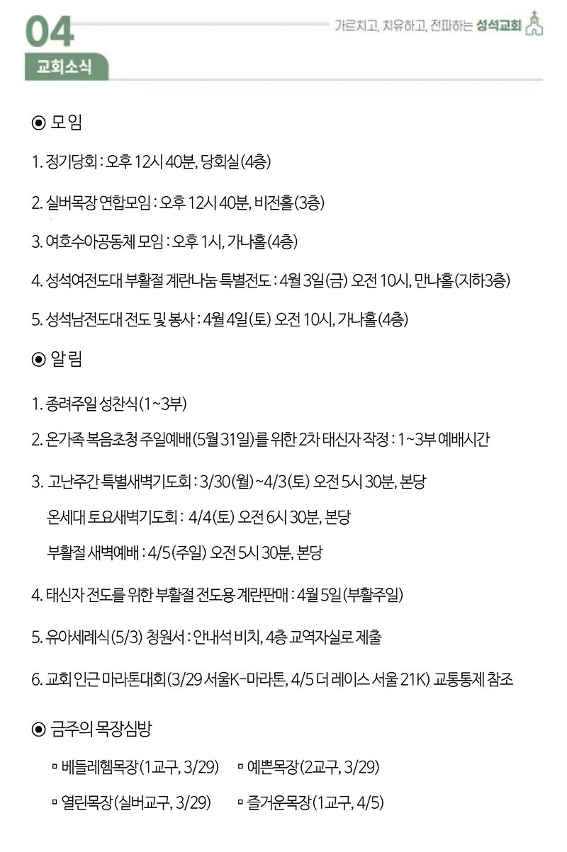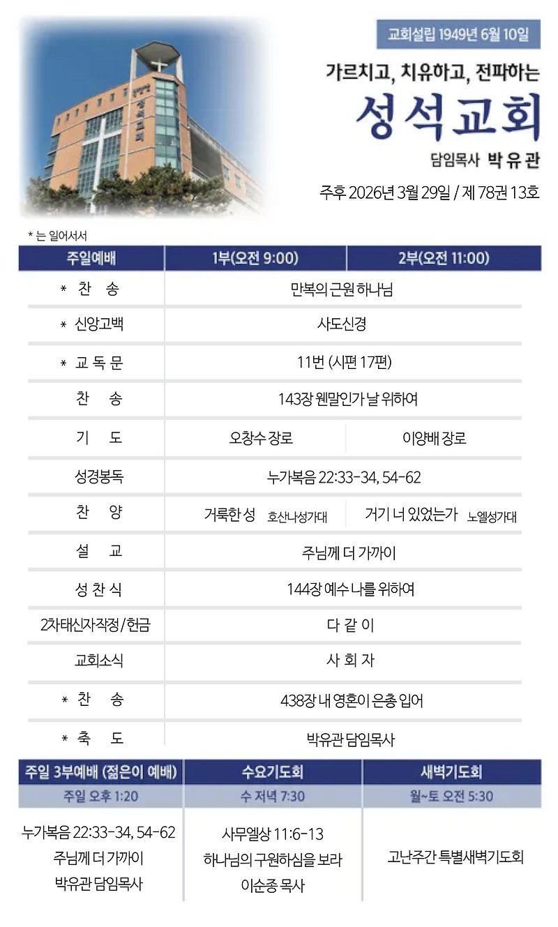 2026.3.29.(주일)주보 작성자김성수|작성시간26.03.28|조회수77 목록 댓글 0 글자크기 작게가 글자크기 크게가 대한예수교장로회 마장동 성석교회 원로목사 김성윤 담임목사 박유관 2026.3.29. 주보 다음검색 현재 게시글 추가 기능 열기 북마크 공유하기 신고 센터로 신고 댓글 댓글 0 댓글쓰기 댓글 리스트