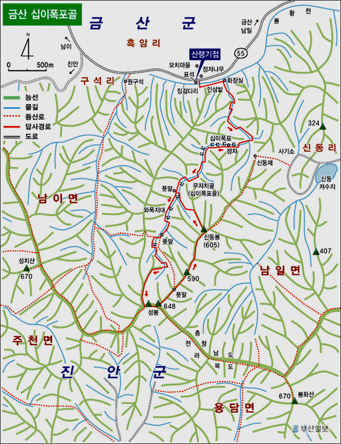 A코스 : 용덕교-성치산-성봉-십이폭포-모치마을(6시간)
