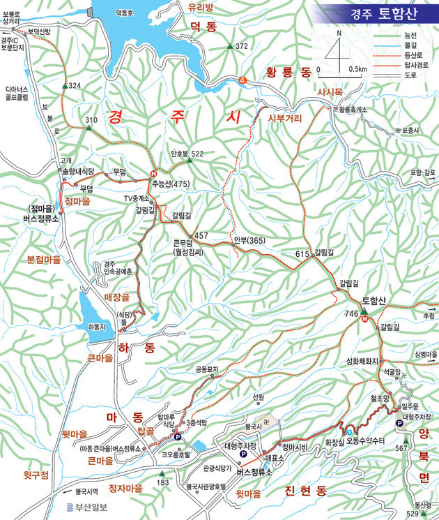 코 스 | ◆A팀코스☞ 솔향내식당-주능선(475봉)-615봉갈림길-토함산- 추령갈림길-성화채화지-석굴암일주문-오동약수터 -청마시비-불국사주차장 : 4.5시간 ◆B팀코스☞ 불국사주차장-석굴암-토함산 : 왕복 : 3~3.5시간 ※상기 시간은 석굴암 및 불국사 관람하지 않을 경우의 예정 시간 입니다. 두 곳을 관람하시면 시간이 연장될 수 있습니다. ※B팀코스는 산행이 아니고 걷기길이라고 보시면 됩니다. |