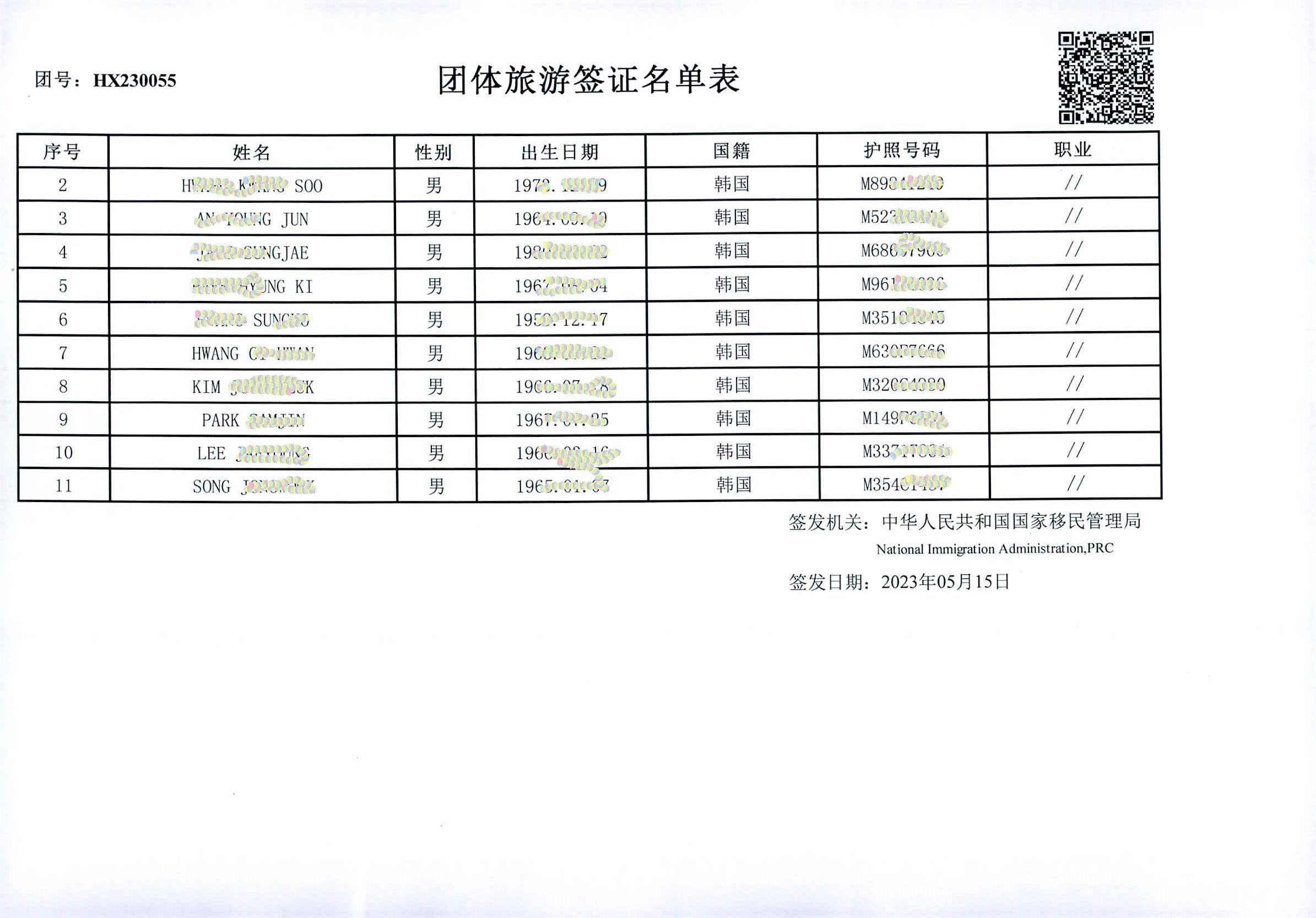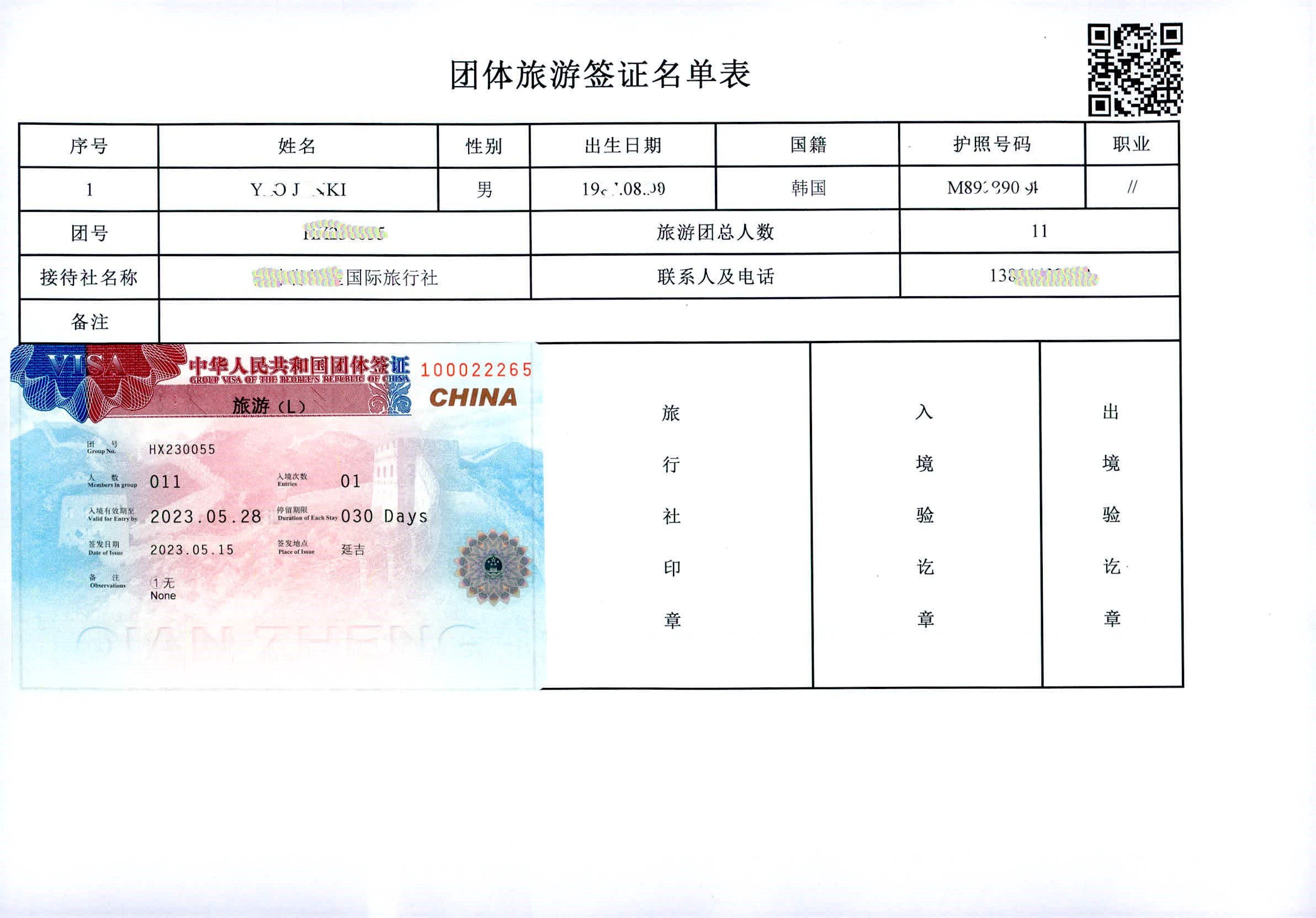 3. 출발 7일전에 현지공안청 출입국비자처 도장을 찍은 단체여행비자 사본을 메일로 보내드린다.