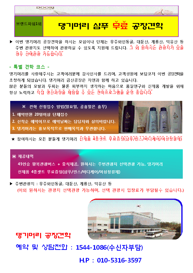 댕기머리샴푸 공장 견학에 여러분을 무료 초대합니다. 작성자댕기낭자|작성시간12.12.05|조회수1,225 목록 댓글 0 글자크기 작게가 글자크기 크게가 다음검색 현재 게시글 추가 기능 열기 북마크 공유하기 신고 센터로 신고 댓글 댓글 0 댓글쓰기 댓글 리스트
