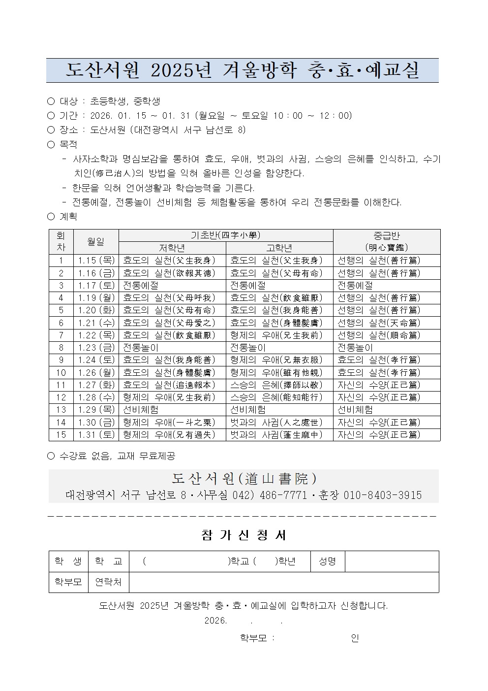 대전 도산서원에서 겨울방학 충효교실(사자소학 명심보감)을 운영합니다 작성자묵정김수영|작성시간25.12.23|조회수42 목록 댓글 0 글자크기 작게가 글자크기 크게가 다음검색 현재 게시글 추가 기능 열기 북마크 공유하기 신고 센터로 신고 댓글 댓글 0 댓글쓰기 답글쓰기 댓글 리스트
