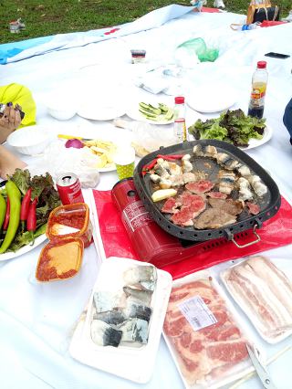 근처 마트에서 돗자리, 가라오케 엠프와 마이크 등을 대여 해 줍니다