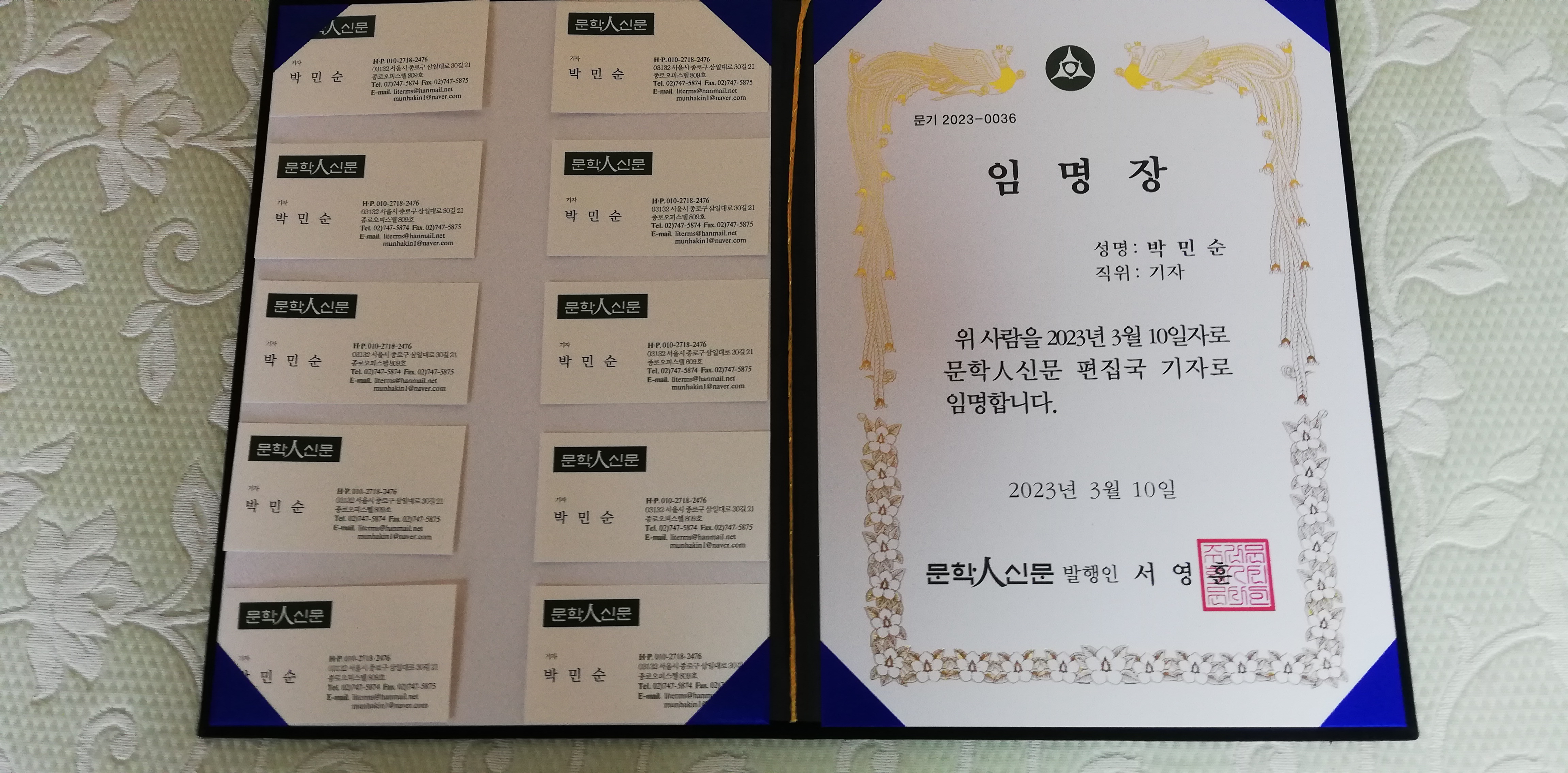 올 3월 10일자로 주간 '문학人신문' 편집국 기자로 임명장과 명함을 받았습니다.