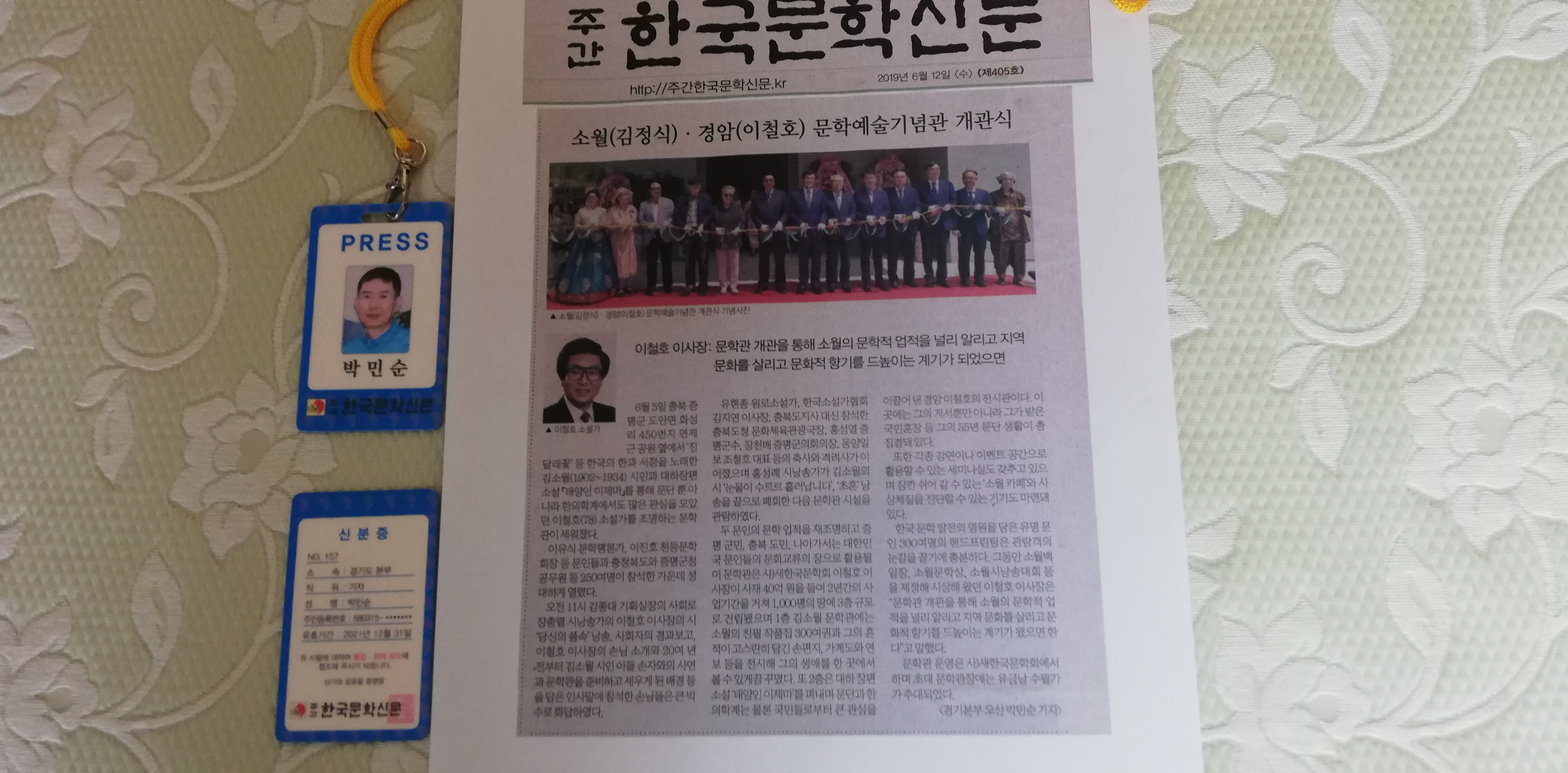 2019년 6월 12일자 주간 '한국문학신문' 1면에 톱 기사로 게재된 김소월, 이철호 문학관 개관식 - 경기본부 오산 박민순 기자.