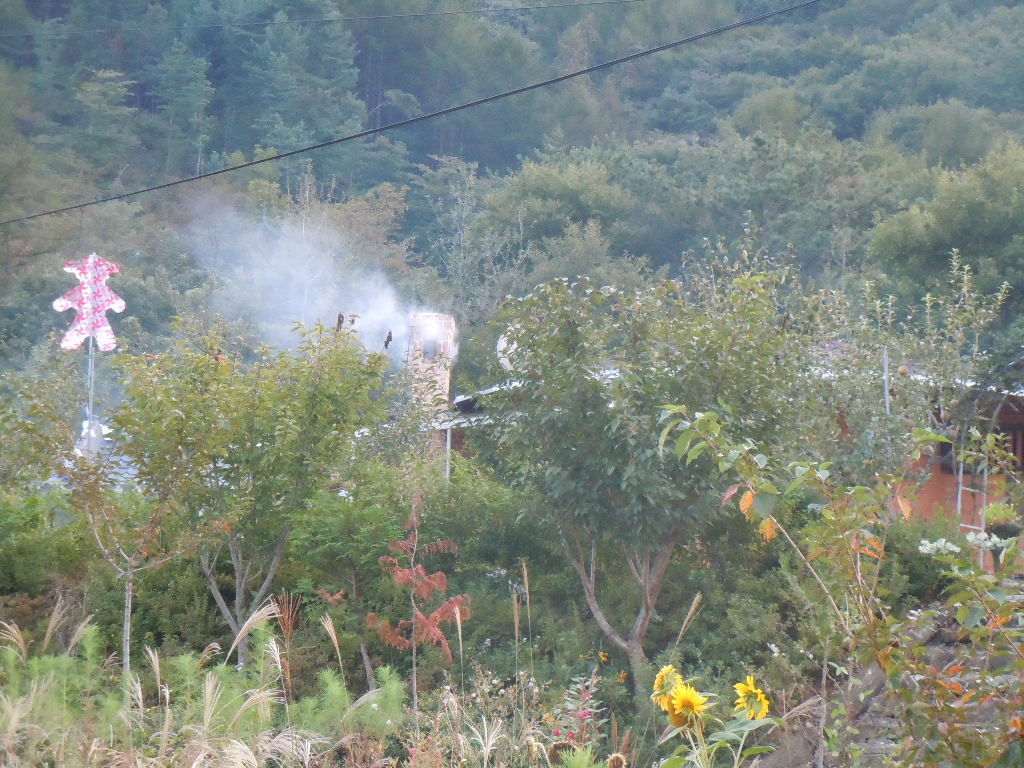 <우리 산방 윗 집에 일 주일에 한 두번 와서 쉬고 가는 사돈(내 큰 며느리의 친정부모)도 나와 같은 생각을 했나보다. 아직 불 땔 사간이 아닌데 벌써부터 연기가 나오는 걸 보니 말이다. 연기를 보니 참나무 장작을 지피는데 불이 잘 들이지 않아 아마도 부채나 풀무로 붙여대며 억지로 장작을 태우는 연기로 보인다. 우리 사돈이 내 경지에 이르려면 2-3년은 더 불목하니 노릇 해야 할 것 같아 걱정이 되기도 한다. ㅎㅎㅎㅎ>