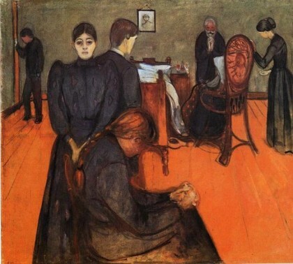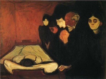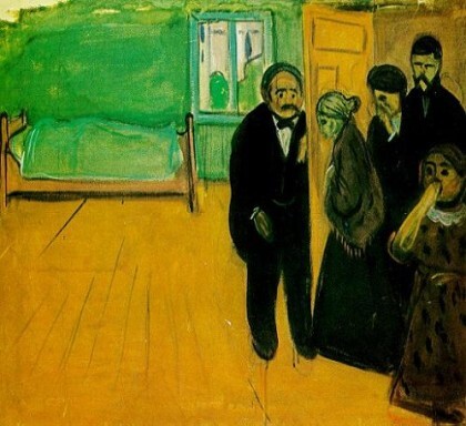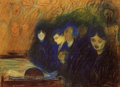 <병실에서의 죽음>과 깊은 연관을 갖는 듯한 계열의 작품으로 여기에서도 역시 고통, 죽음, 불안에 대한 내용을 시각화하고 있다. 여기에서 특이한 것은 대담 한 콤포지션으로 왼쪽 상단 부분에 침대를 놓고 나머지 아래 부분은 빈 공간으로서 처리하고 실의에 찬 사람들을 오른쪽 부분으로 몰아 놓은 것이, 허탈한 공간 감과 긴장된 중압감이 대비를 이루면서 표현되어지고 있다. 단조로운 색채와 강직한 형태감은 대담한 구도와 조화를 이루면서 상징적 표현 효과를 주고 있다. 드라마틱한 모습을 적절하게 나타내고 있으면서도 죽음을 둘러싼 허(虛)와 실(實), 공백과 실재(實在)의 대조적인 관계를 표현하는 데 주안점을 두었다. 간결하면서도 생략되어진 인물의 표정과 단조로운 필세는 희화화(戱畵 化)된 것처럼 단순화되어 보이는 것이 충격있게 전달되어지고 있다.