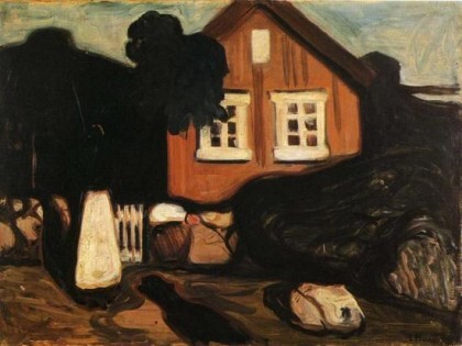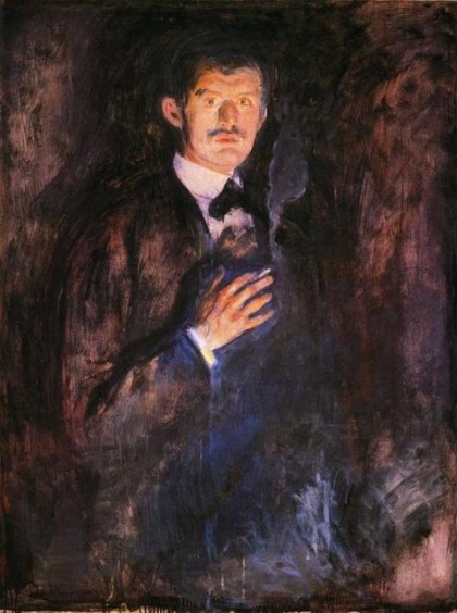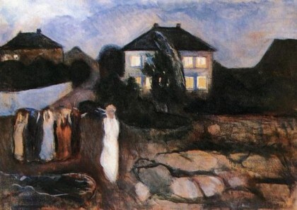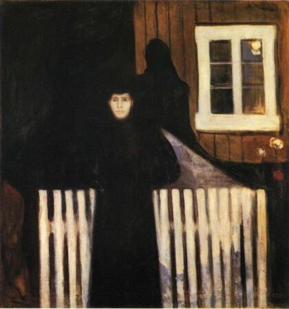뭉크의 분열증 증세는 1890년 도라 라우젠과의 연애로 고민과 알콜에 의해 더욱 심화되어지면서 신경 쇠약 상태가 한때 계속되어지기도 하는데, 공허한 듯하면서도 무엇의 의미를 찾으려는 기묘한 눈을 크게뜨고, 정면을 응시하고 있는 검은 옷의 군상(群像)의 표정은 뭉크의 자주 다루어진 주제이기도 하다. 이러한 정면성(正面性)에 대하여 혹간 말하기를 분열병 심리에서의 표현성, 친화성(親和性)이라고 강조하는 사람들도 있기는 하나, 뭉크의 근원적인 위문이나 불안이 이와 같은 일련의 작품을 창작토록 하였다고 할 수 있겠다. 저녁놀을 배경으로 하여 나타난 산과들에서의 곡선적 효과는 불안한 감정을 더욱 강하게 느끼도록 한다. 유화에서 뿐만 아니라 목판화에서도 동일한 내용의 표현을 많이 남기고 있다.