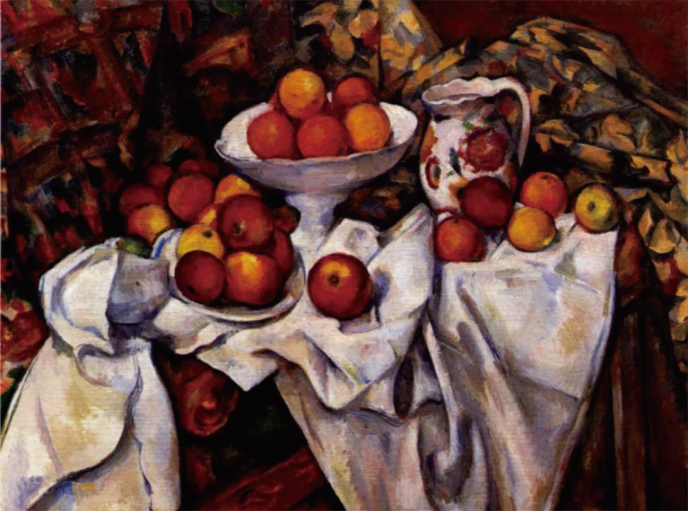 그러나 세잔에게는 내가 조절할 수 없는 어떤 것을 그리는 것이 아니라 구성과 연출이 자유로운 사과는 예술가의 의도를 마음대로 표현할 수 있는 최적의 대상이었다. 아래에서 올려다본 사과, 옆에서 본 사과, 위에서 내려다본 사과 등 시선을 모두 한 그림에 담아 여러 관점을 표현하려 노력했다. 이것을 통해 대상의 질서 자체를 바꾸는 것이 그림의 진정한 힘이라고 생각한 것이다.